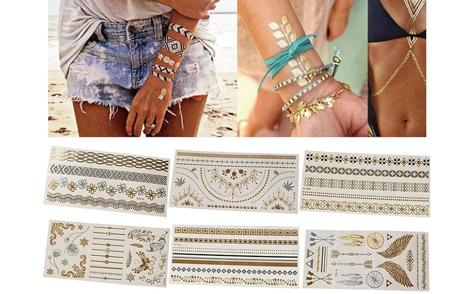 Amacoam Festival Tattoos Gold Temporare Tattoos Halloween Tattoos Metallic Tattoo Wasserdicht 6 Blatter 70 Mustern Glitzer Tattoo Silber Fur Frauen Jugendliche Madchen Festival Party Accessoire Amazon De Spielzeug